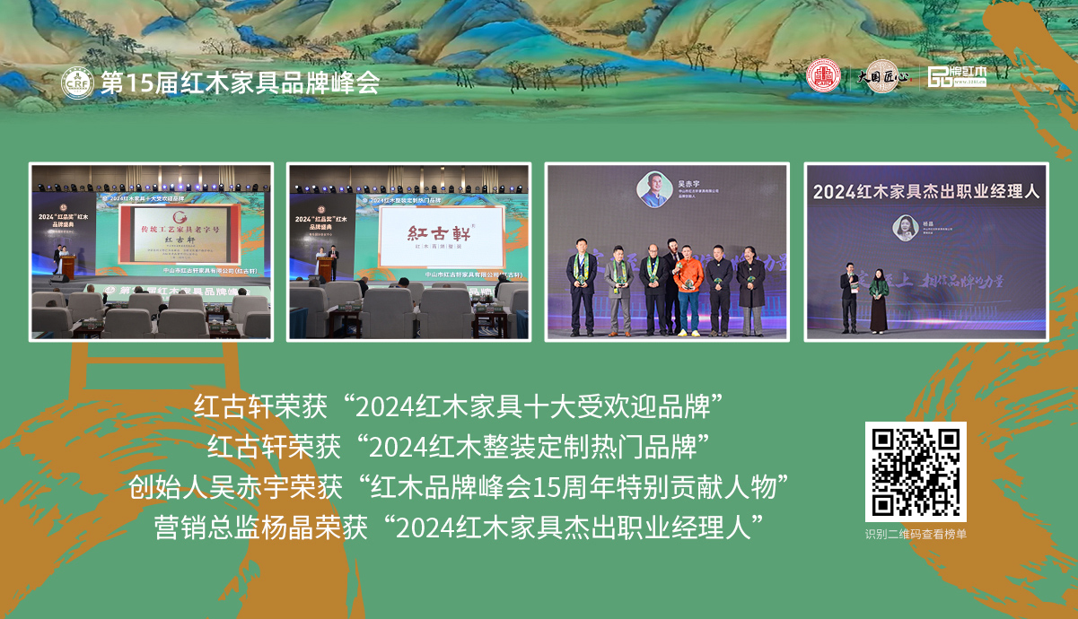 禮遇千年前的中國智慧 格物致知 修身齊家 走進(jìn)紅古軒 一廿間,二十八載。28年,跨越時(shí)代進(jìn)入新紀(jì)元;28年,待時(shí)乘勢,根深葉茂;28年,讓新中式成為時(shí)代。 創(chuàng)始人故事 1997年創(chuàng)立紅古軒,2002年在紅木行業(yè)提出“新中式紅木家具”。如今,紅古軒以富于藝術(shù)創(chuàng)造的產(chǎn)品與文化引領(lǐng)紅木家具發(fā)展... 品牌故事 品牌榮耀 品牌歷程 人物故事
